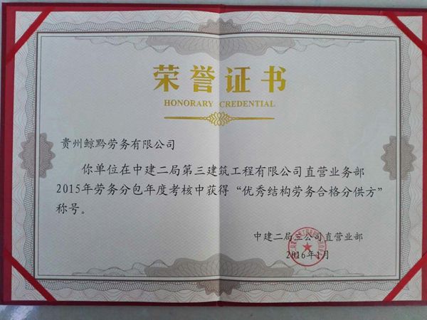本報(bào)訊|:熱烈祝賀公司在中建第二局第三建筑工程有限公司直營(yíng)業(yè)務(wù)部2015年勞務(wù)分包年度考核中獲得”優(yōu)秀結(jié)構(gòu)勞務(wù)合格分供方“稱號(hào),同時(shí)在中建第二局第三建筑工程有限公司45家勞務(wù)企業(yè)中2015年度直營(yíng)業(yè)部結(jié)構(gòu)勞務(wù)分包綜合考評(píng)中獲得第六名。